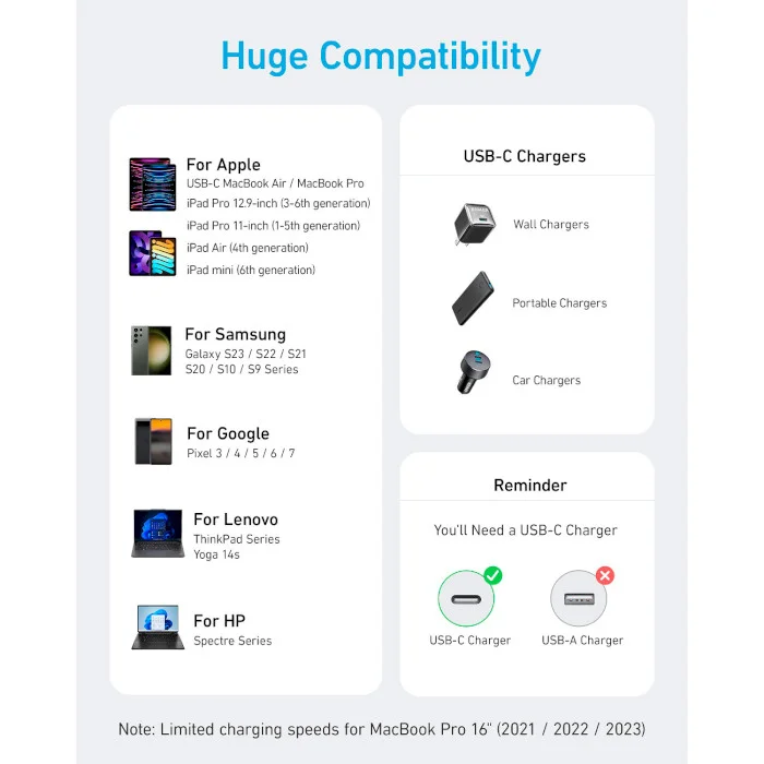 Compatibility Laptops (MacBook, Dell, etc.), phones (iPhone 15, Samsung, Google Pixel), tablets, and other USB-C devices